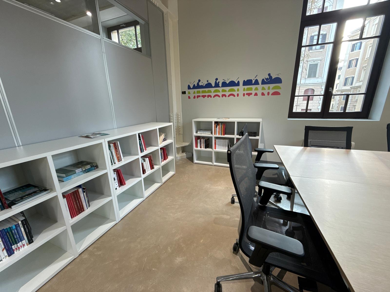 Al piano terra, il cortile è pensato come spazio pubblico aperto a tutte e a tutti, una cornice flessibile per dibattiti, eventi, laboratori all’aperto e spettacoli. Lo spazio di accoglienza, con un piccolo bookshop, introduce a un ambiente polifunzionale modulabile per conferenze, meeting, proiezioni, incontri pubblici.